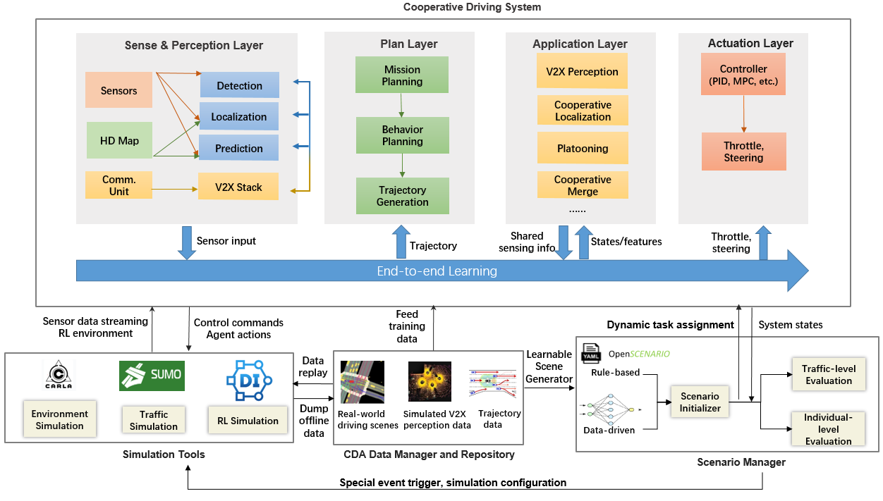 OpenCDA provides a full-stack software that contains the common self-driving modules including sensing, planning and actuation layers , and it is developed purely in Python for fast prototyping. Built upon these basic modules, OpenCDA supports a range of common cooperative driving applications. -